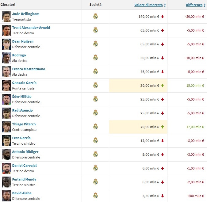 3月16日讯 德转更新了皇马球员的最新身价变化,其中贝林厄姆下降2000万欧元,现身价1.4亿欧元,小将皮塔奇身价上涨1700万欧元,来到2000万欧元。